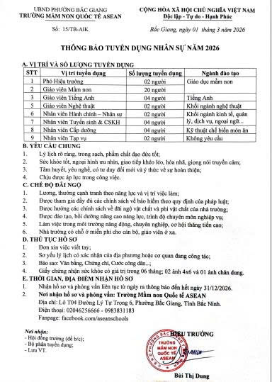 Asean School cần tuyển gấp 16 Giáo viên Mầm non làm việc tại Thành phố Bắc Giang