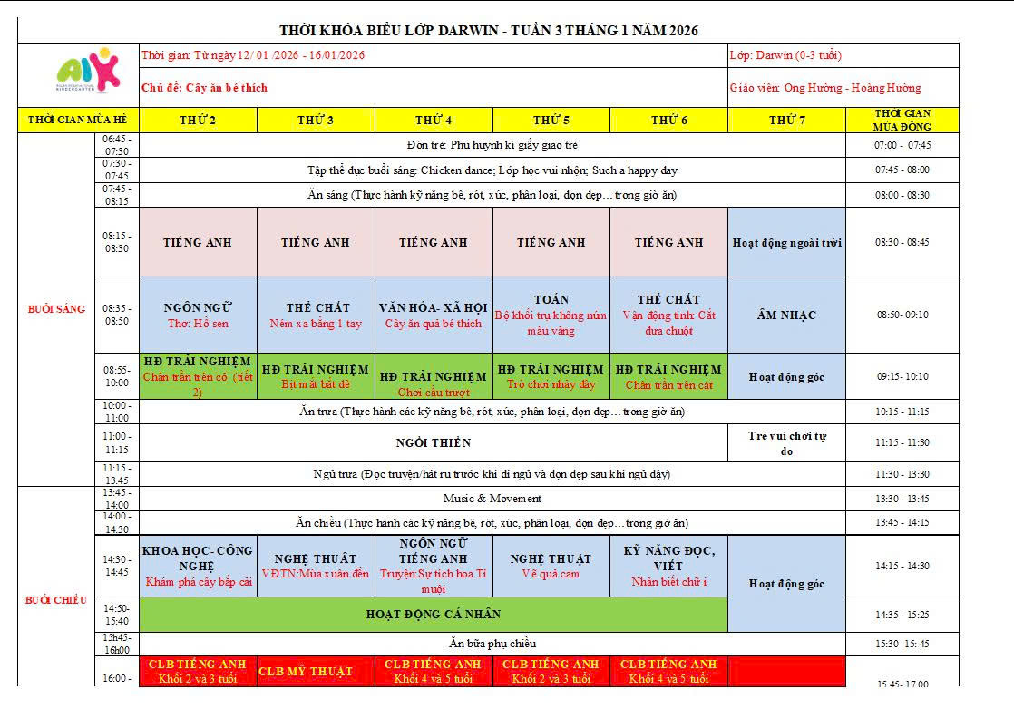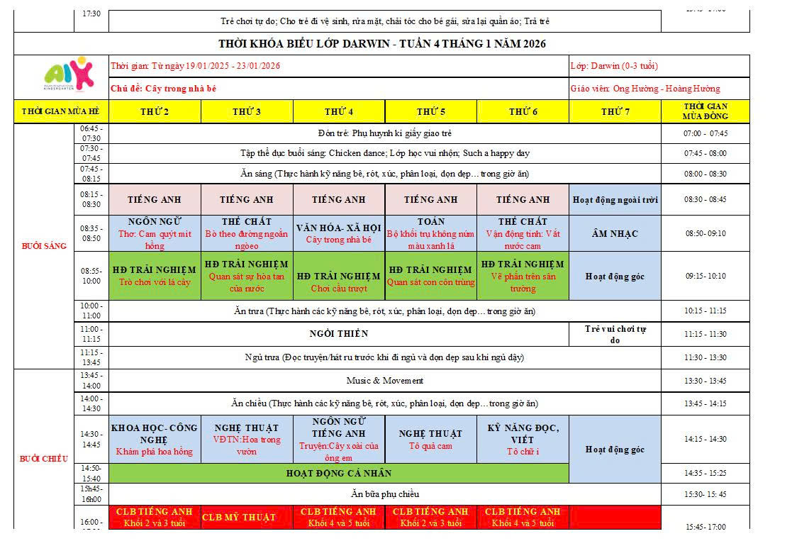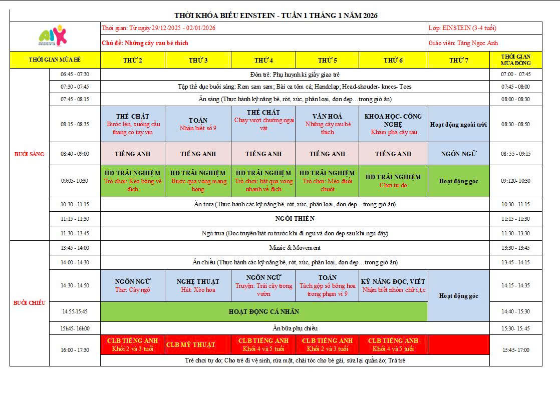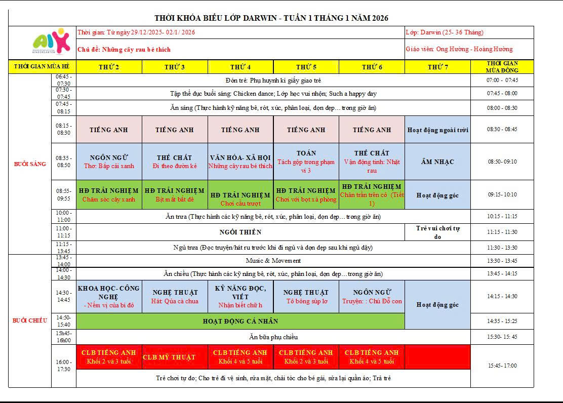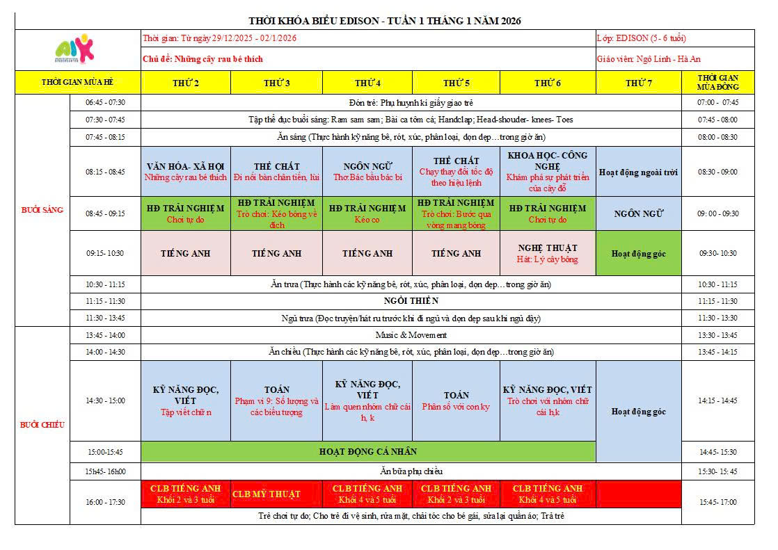 THỜI KHÓA BIỂU THÁNG 1 NĂM HỌC 2025-2026