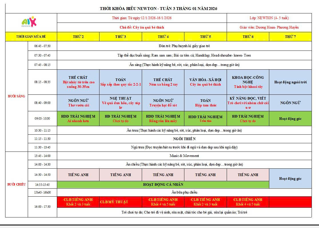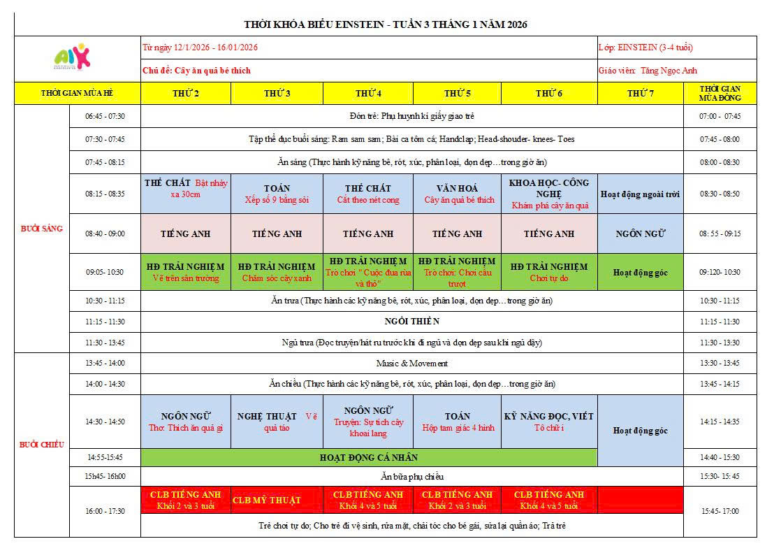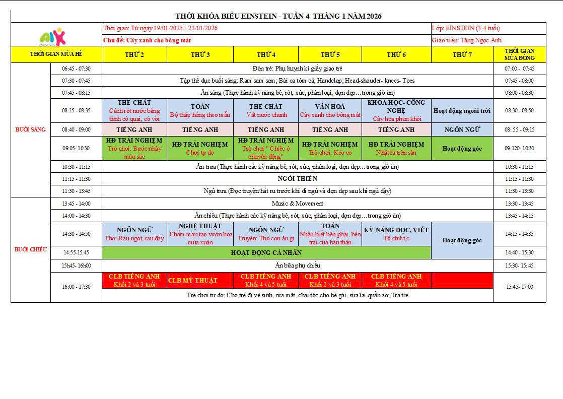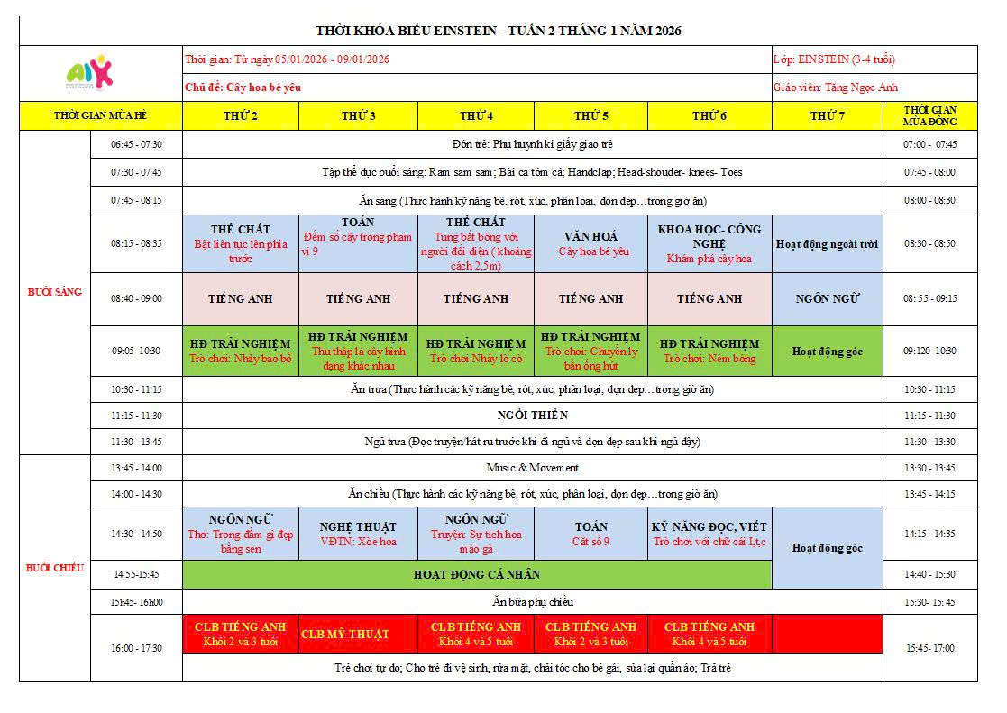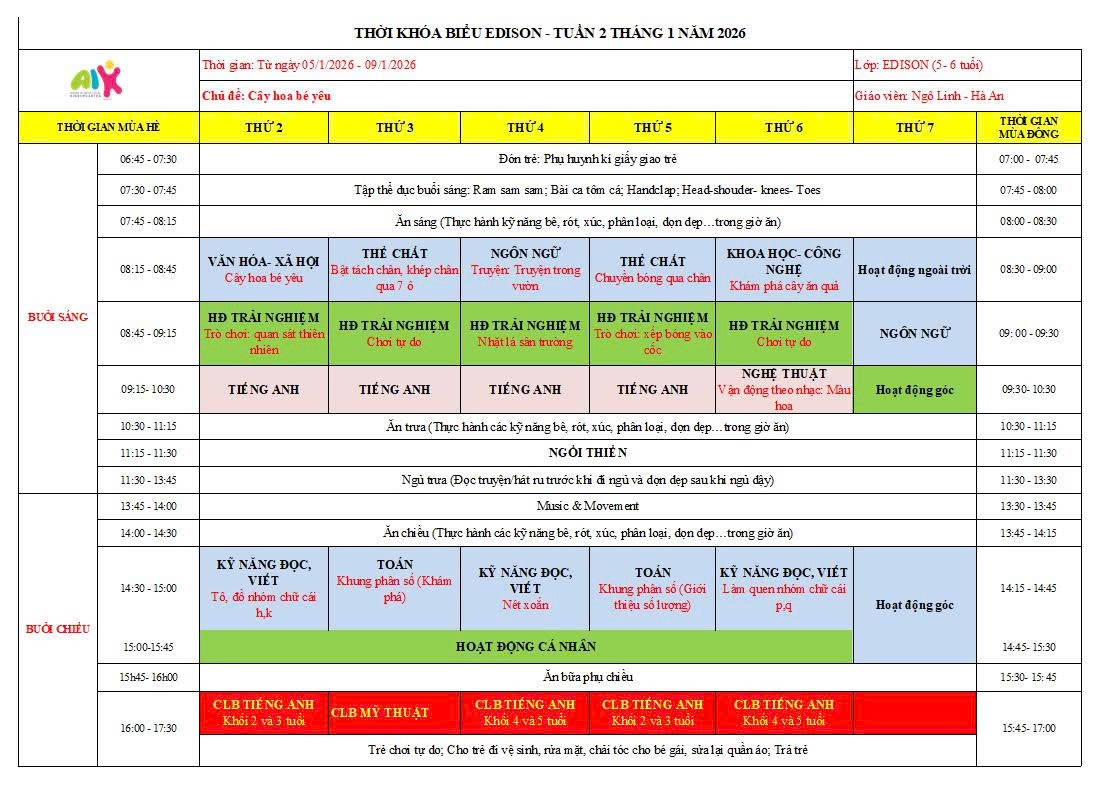 THỜI KHÓA BIỂU THÁNG 1 NĂM HỌC 2025-2026