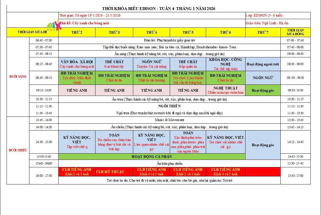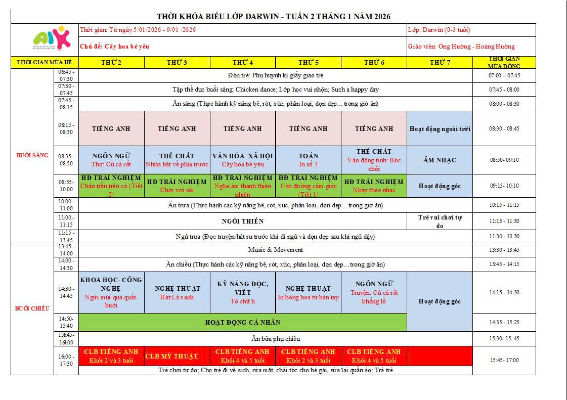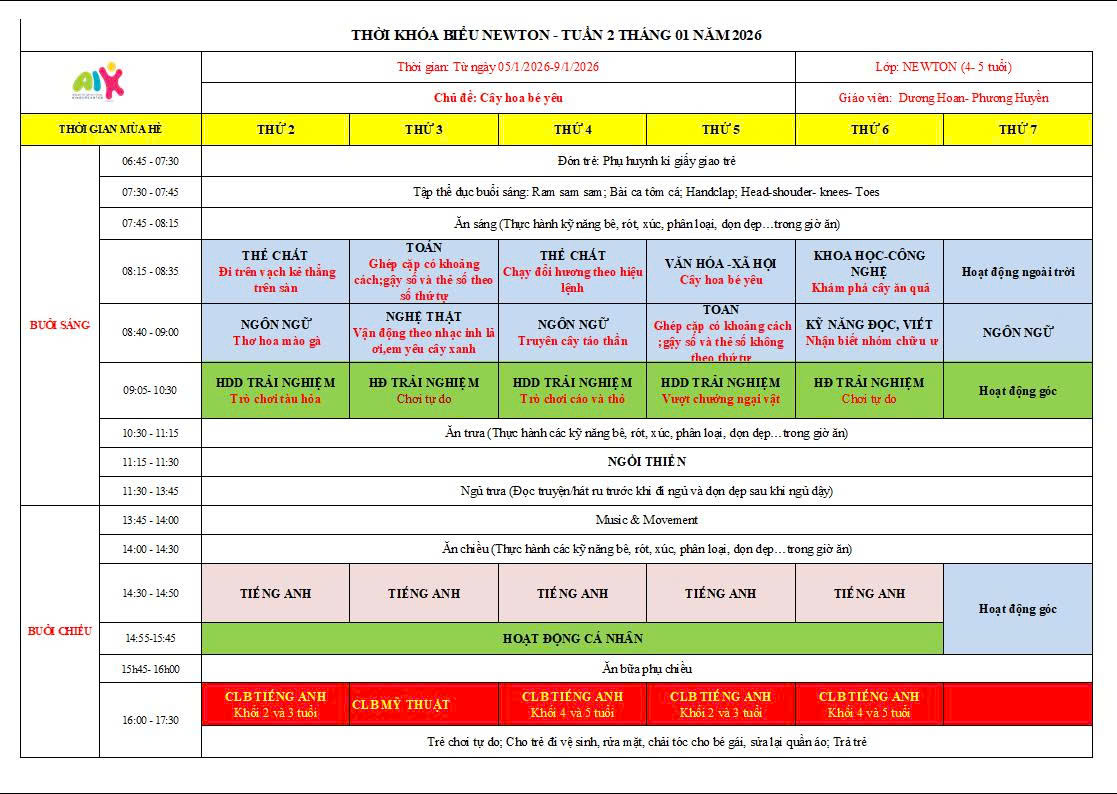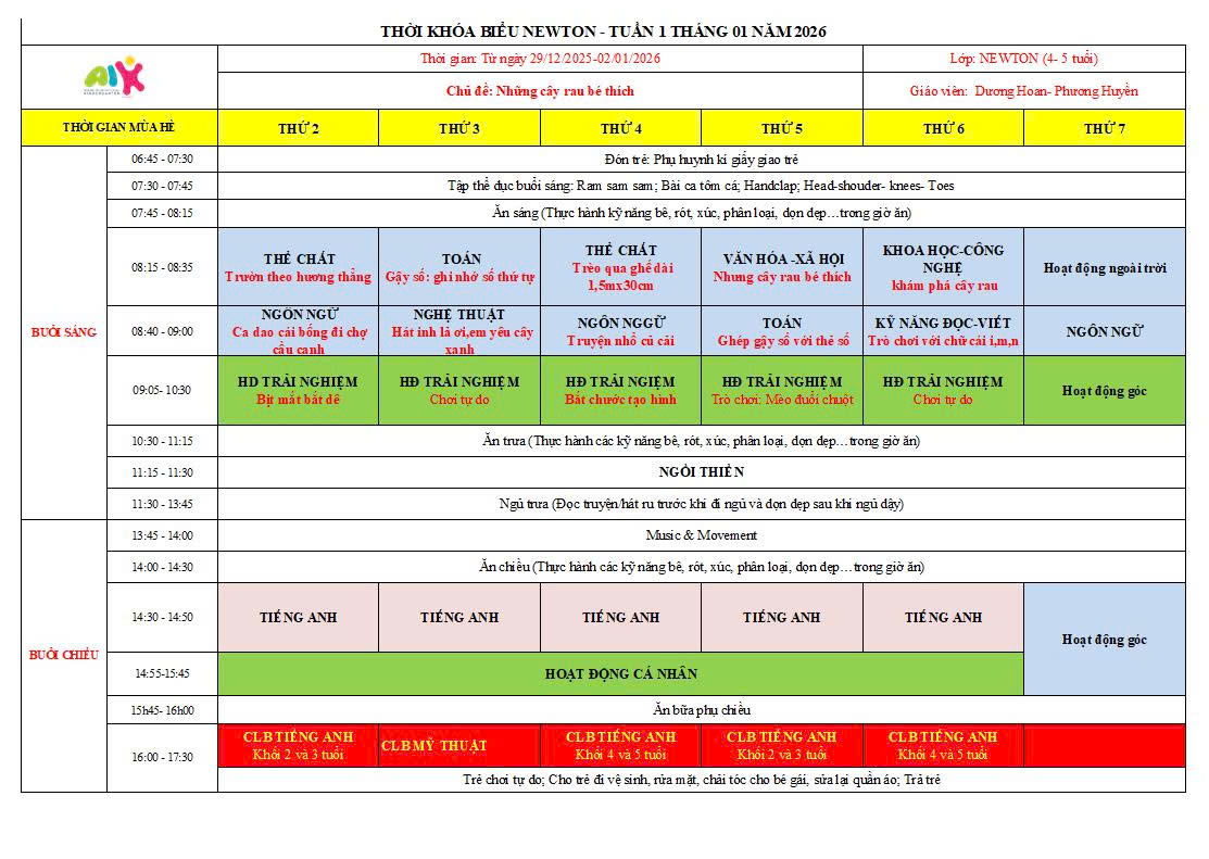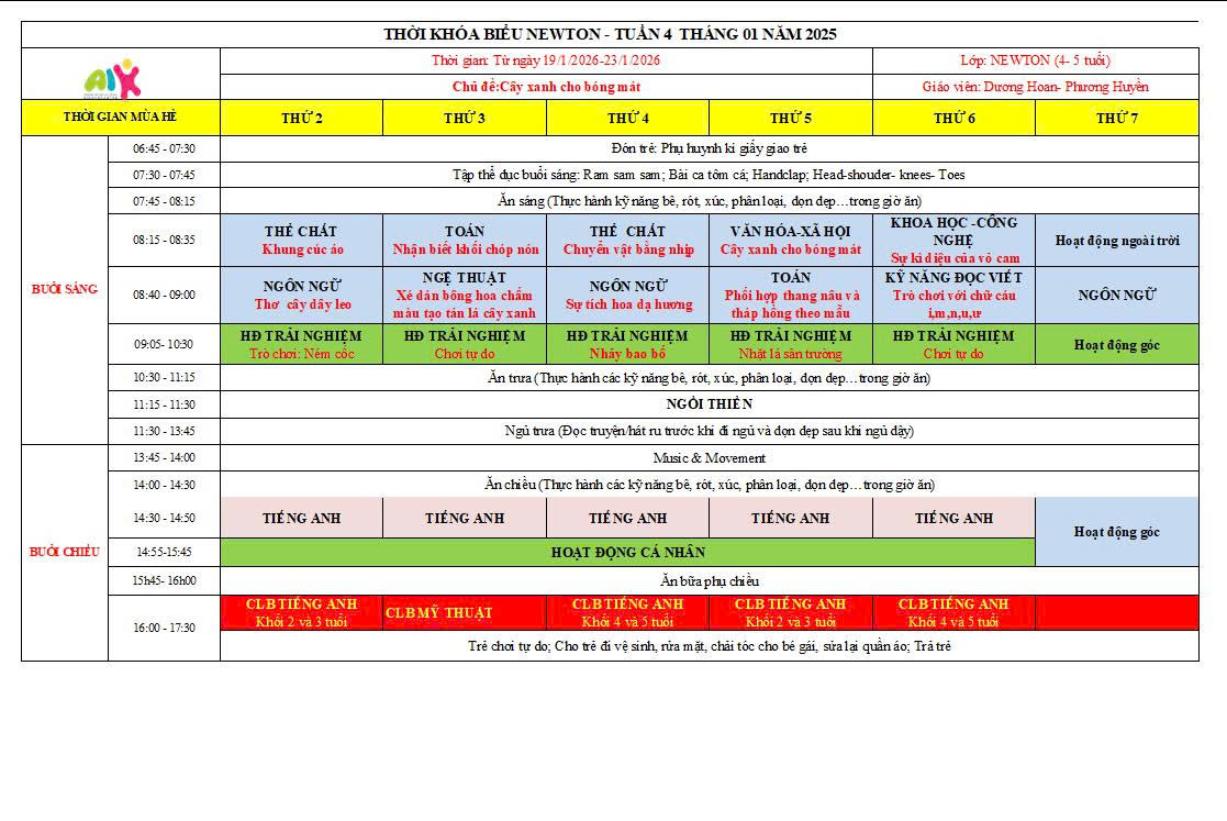 THỜI KHÓA BIỂU THÁNG 1 NĂM HỌC 2025-2026