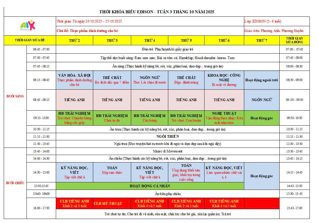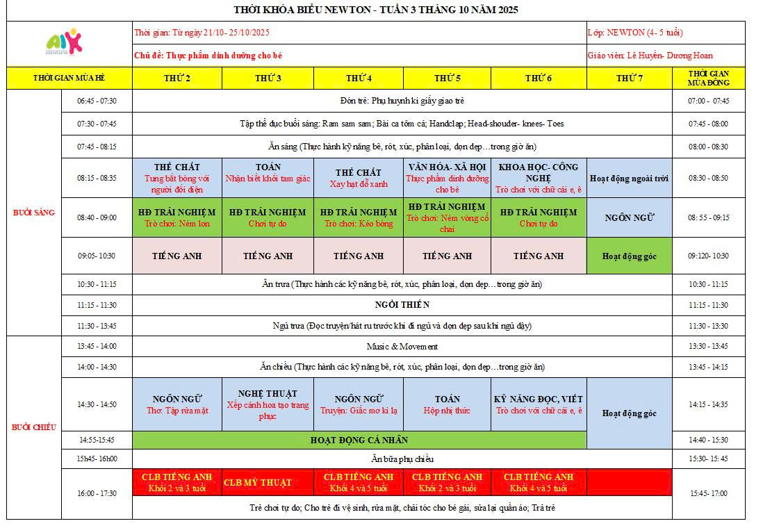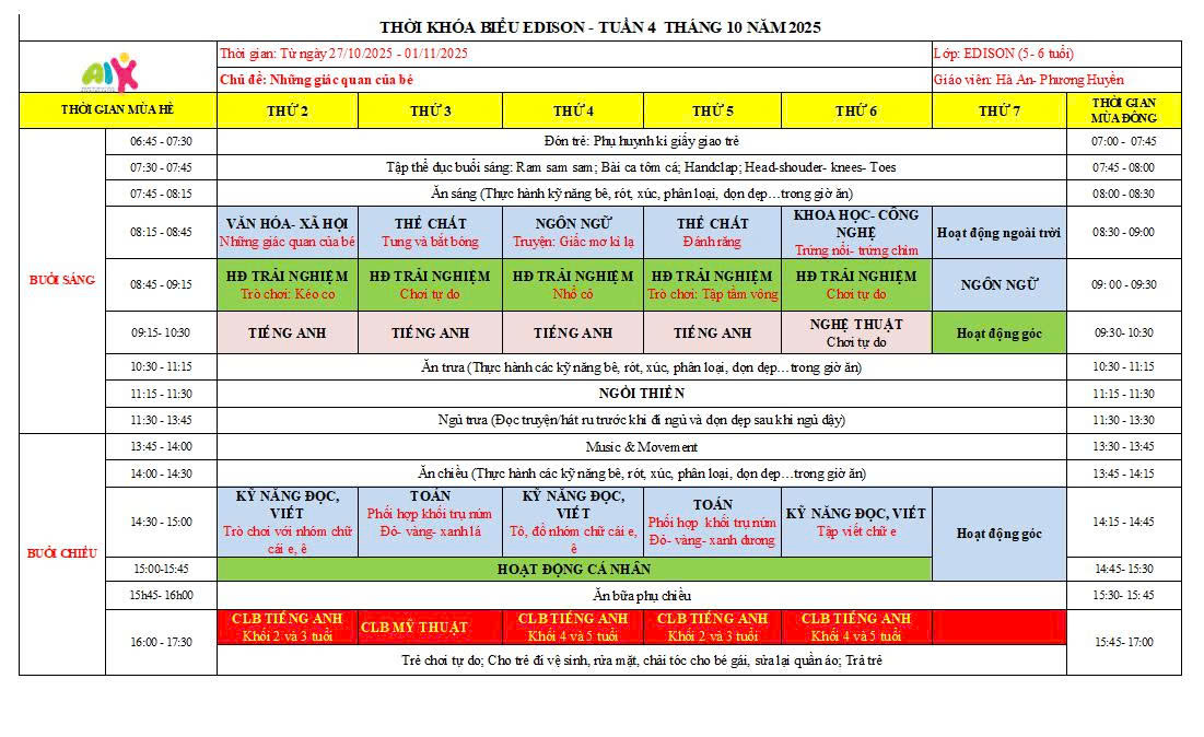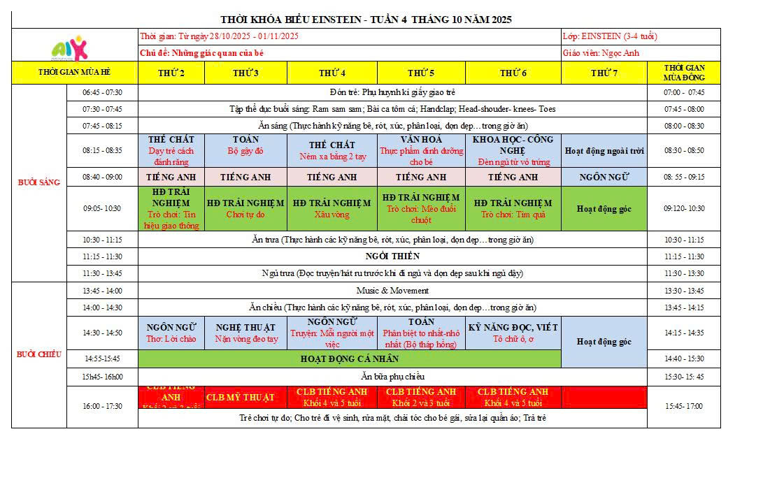 THỜI KHÓA BIỂU THÁNG 10 NĂM HỌC 2025-2026