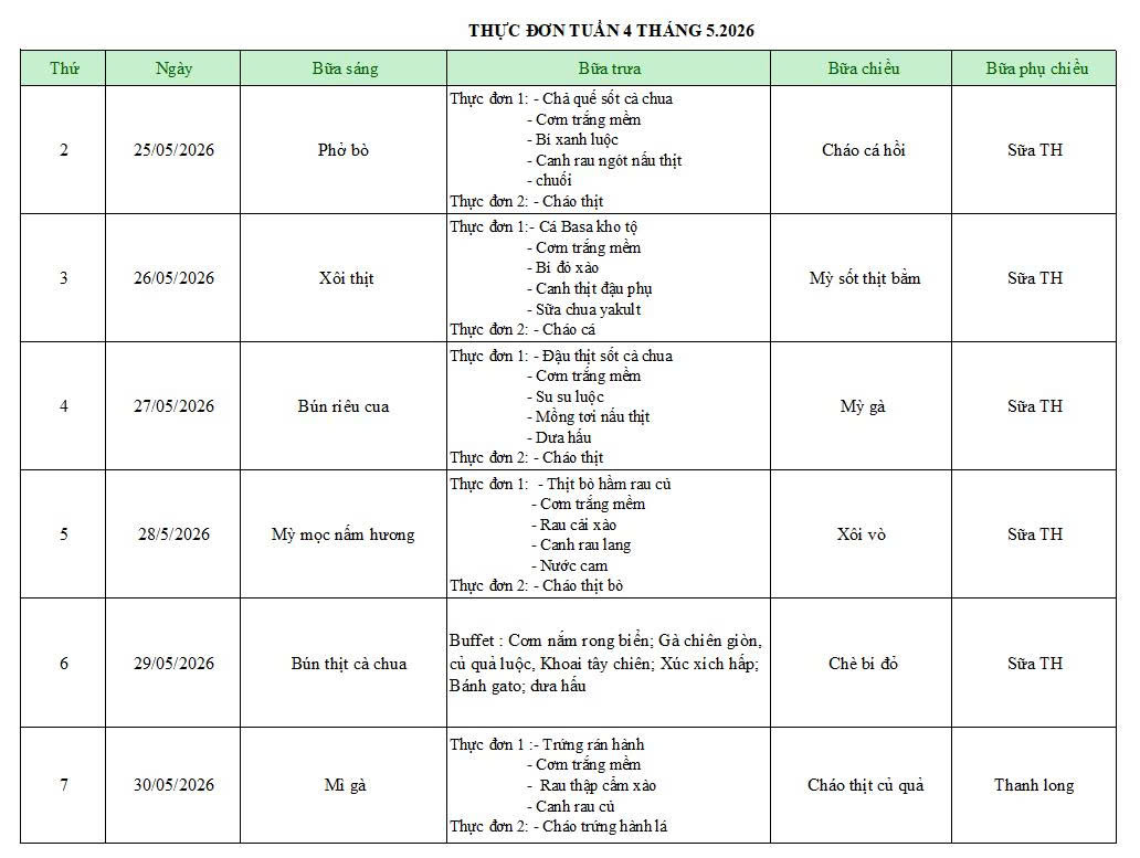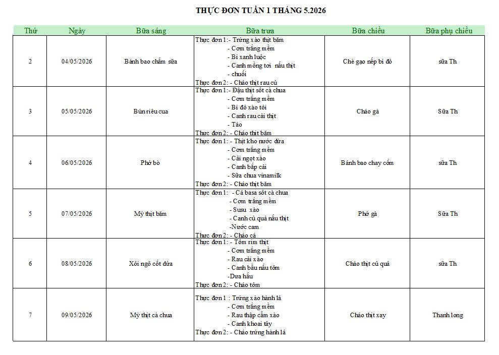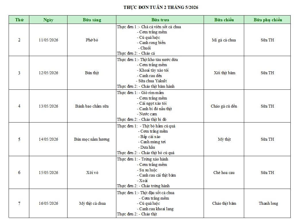 Thực đơn Tuần 2 tháng 5 năm 2022
