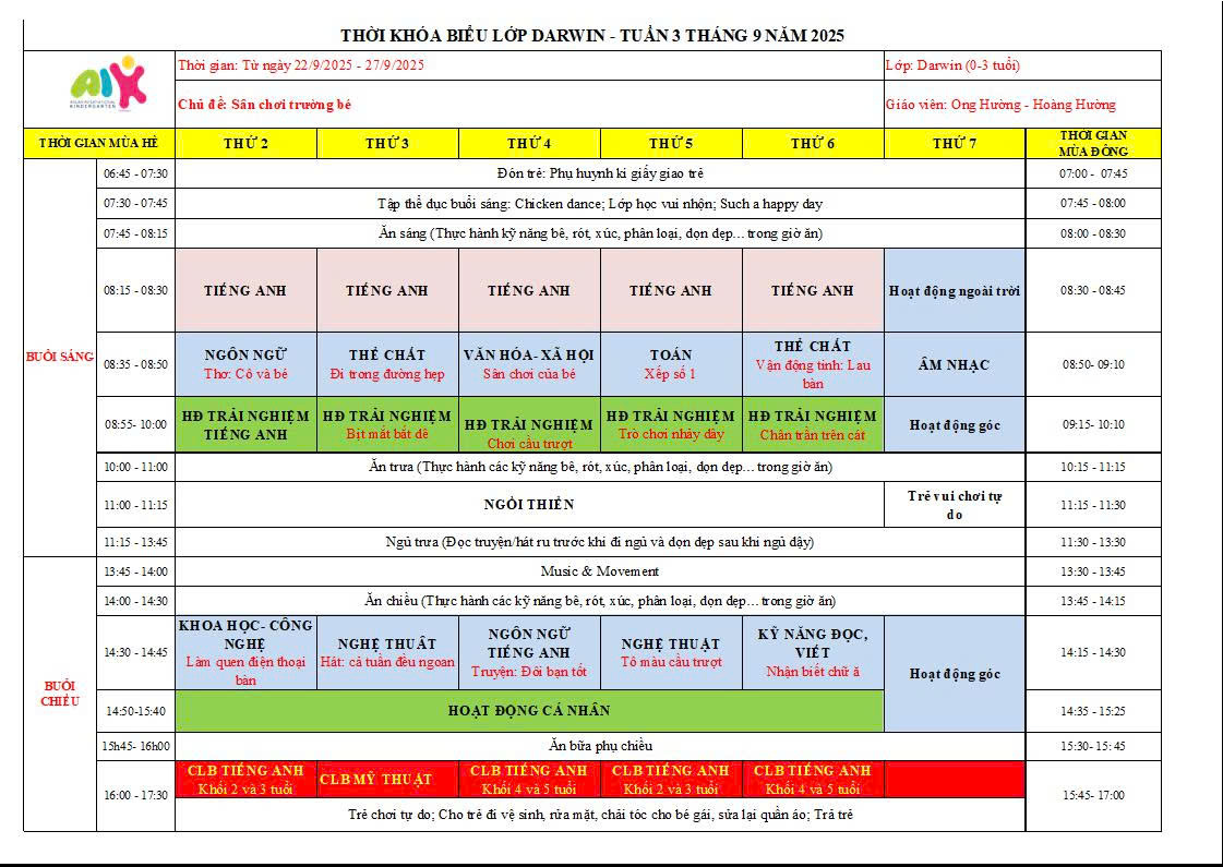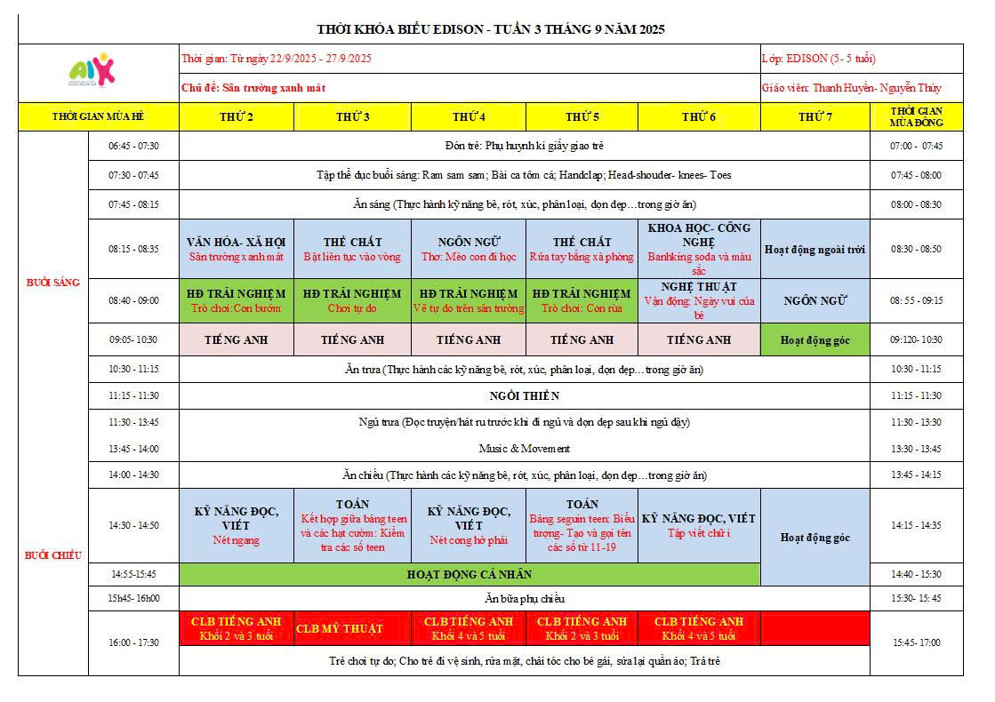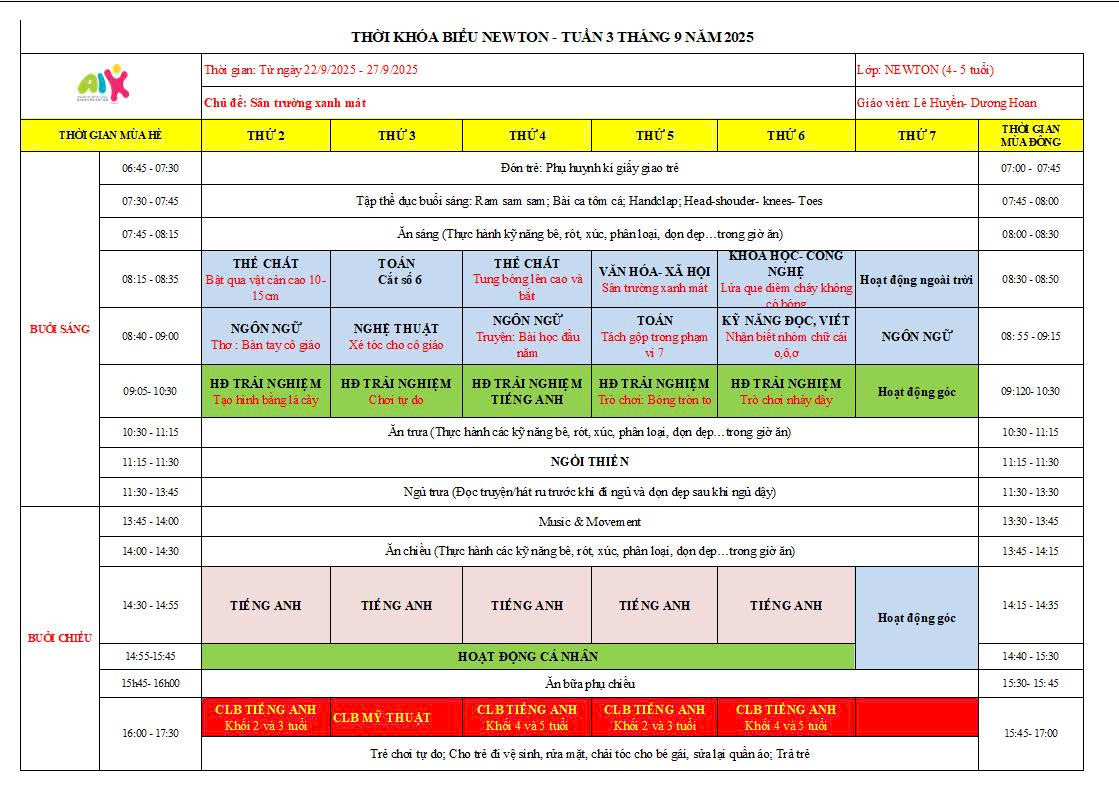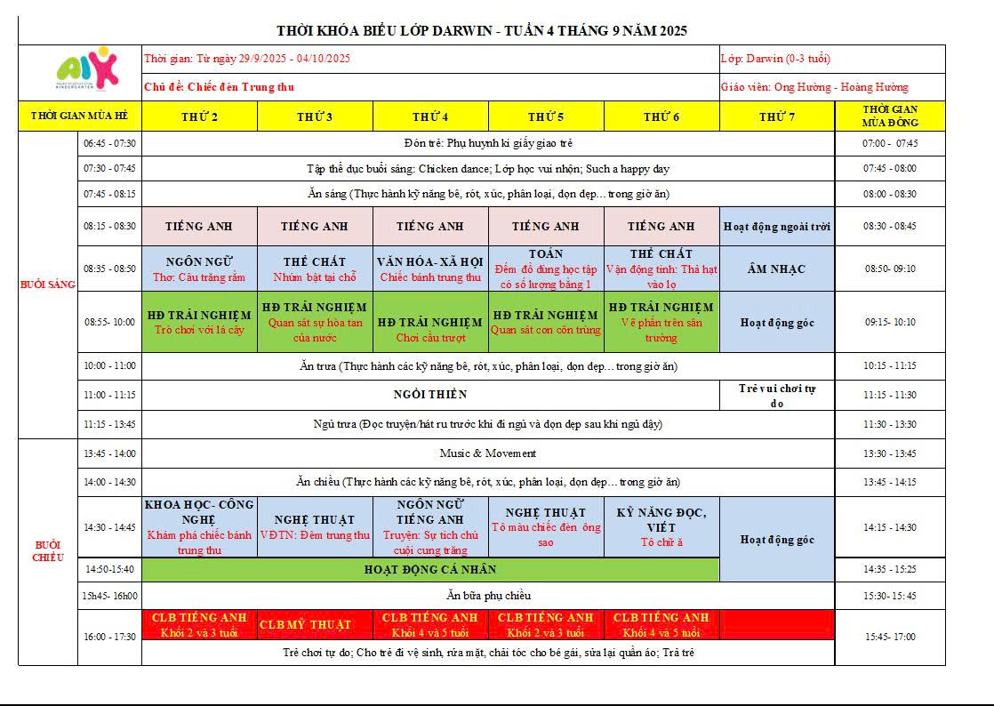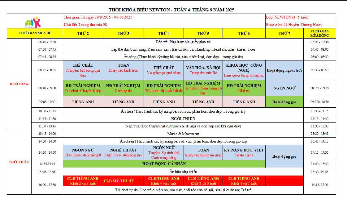 THỜI KHÓA BIỂU THÁNG 9 NĂM HỌC 2025-2026