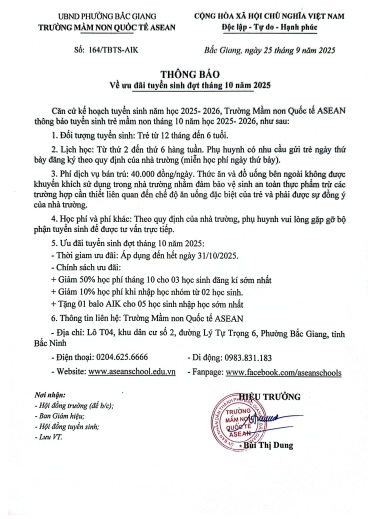 Với sứ mệnh kiến tạo một nền giáo dục vì hòa bình, nơi nuôi dưỡng tâm hồn và tôn trọng từng nhịp độ phát triển tự nhiên của mỗi trẻ, qua đó giúp trẻ đạt tới tiềm năng tối đa của bản thân và thành công ở bậc học cao hơn, Asean School tự hào là ngôi trường tiên phong trong việc áp dụng các chương trình và phương pháp giáo dục hội nhập và tiên tiến nhất.