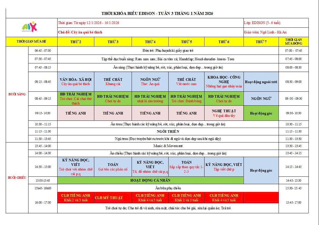THỜI KHÓA BIỂU THÁNG 1 NĂM HỌC 2025-2026