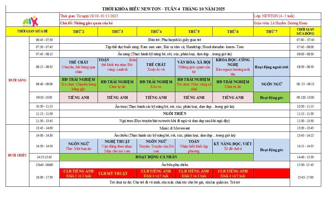 THỜI KHÓA BIỂU THÁNG 10 NĂM HỌC 2025-2026