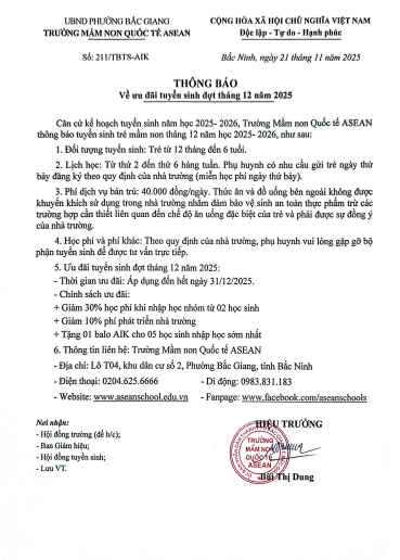 Với sứ mệnh kiến tạo một nền giáo dục vì hòa bình, nơi nuôi dưỡng tâm hồn và tôn trọng từng nhịp độ phát triển tự nhiên của mỗi trẻ, qua đó giúp trẻ đạt tới tiềm năng tối đa của bản thân và thành công ở bậc học cao hơn, Asean School tự hào là ngôi trường tiên phong trong việc áp dụng các chương trình và phương pháp giáo dục hội nhập và tiên tiến nhất.
